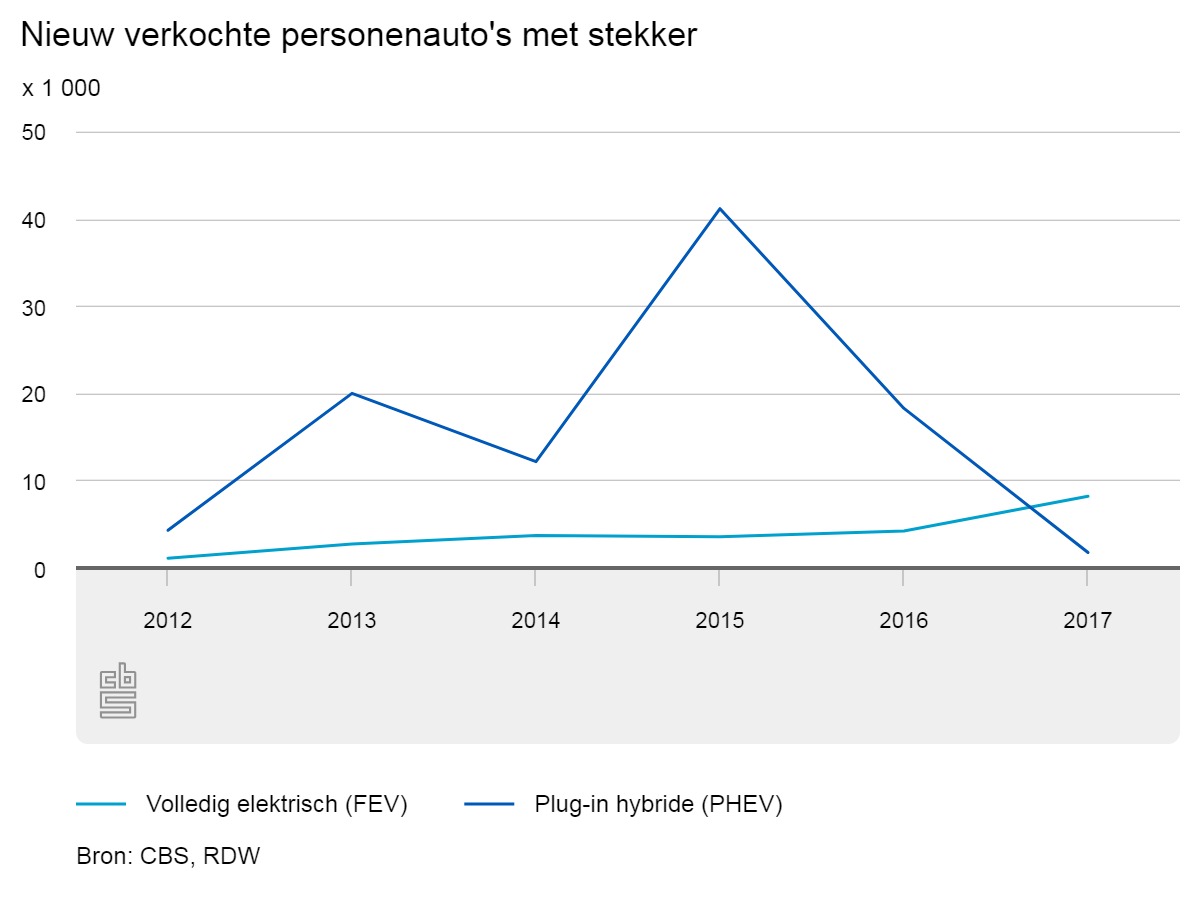 In 2017 werden 8,2 duizend personenauto's verkocht die volledig elektrisch rijden. Dat is nagenoeg een verdubbeling van het jaar daarvoor. Dat jaar werden ook voor het eerst meer volledig elektrische auto's verkocht dan hybride modellen. Het CBS geeft aan dat dit onder andere komt door de veranderde fiscale regels rond deze voertuigen, zoals de aanscherping van de bijtelling.